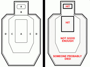Here’s the two versions of “acceptable hit thinking” that I use for practice (of course I don’t write the words on the targets I use, but that’s how I think about it).  Obviously competition shooting is on the left, and self-defense practice is on the right: